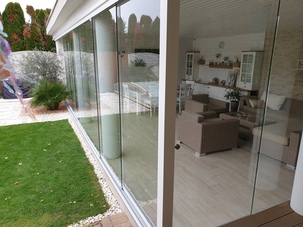 Bezrámové zasklenie krásnej priestrannej terasy rodinného domu. Pri zasunutí sklenených tabúľ za vedľajšiu budovu, sklá sú prakticky neviditeľné a tým terasa je úplne otvorená.